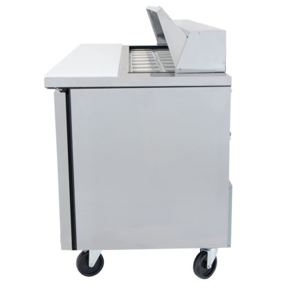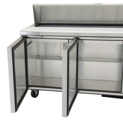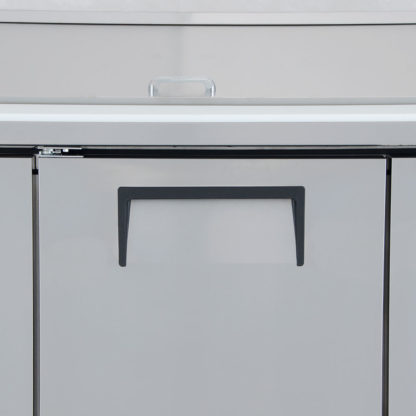 Sandwich/Salad Unit, (18) 1/6 size (4″D) poly pans, stainless steel insulated cover, 11-3/4″D cutting board, (3) full doors, (6) PVC coated adjustable wire shelves, stainless steel top/front/sides, aluminum back, aluminum interior with stainless steel floor, 5″ castors, R290 Hydrocarbon refrigerant, 1/2 HP, 115v/60/1-ph, 7.2 amps, NEMA 5-15P, cULus, UL EPH Classified, Made in USA