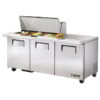 Measuring 725/16 inches wide by 351/16 inches deep, the True TSSU-72-18M-B-HC food prep table is ideal for high-volume salad and sandwich operations. It comes with 18 sixth-size, 4-inch-deep pans in its rail compartment but can also hold 6-inch-deep pans, which are sold separately. Because a foam-insulated hood and lid cover the pans, cold air stays around the products to maintain freshness. To create a sturdy prep station, a removable cutting board spans across the front, measuring 87/8 inches deep by 1/2 inches thick.