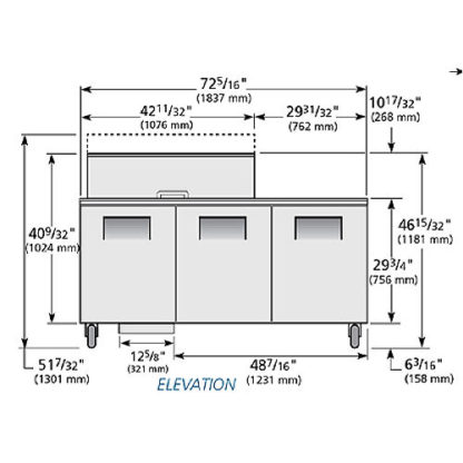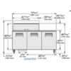 Mega Top Sandwich/Salad Unit, (18) 1/6 size (4″D) poly pans, stainless steel insulated cover, 8-7/8″D cutting board, (3) full doors, (6) PVC coated adjustable wire shelves, stainless steel top/front/sides, aluminum back, aluminum interior with stainless steel floor, 5″ castors, R290 Hydrocarbon refrigerant, 1/2 HP, 115v/60/1-ph, 7.2 amps, NEMA 5-15P, cULus, UL EPH Classified, Made in USA