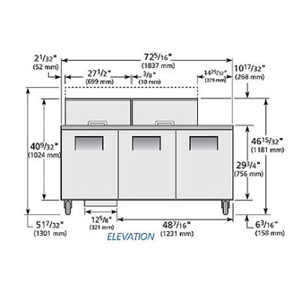 Mega Top Sandwich/Salad Unit, 34″ work surface height, (24) 1/6 (4″D) poly pans, (2) stainless steel covers, 8-7/8″D cutting board, (3) full doors, (6) PVC coated adjustable wire shelves, stainless steel top, front & sides, aluminum back, aluminum interior with stainless steel floor, 3″ castors, R290 Hydrocarbon refrigerant, 1/2 HP, 115v/60/1-ph, 7.2 amps, NEMA 5-15P, cULus, UL EPH Classified, ADA Compliant, Made in USA