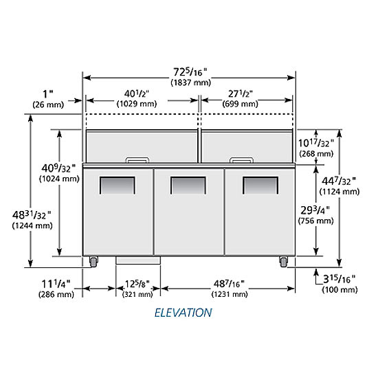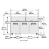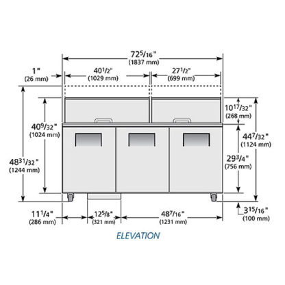Mega Top Sandwich/Salad Unit, 34″ work surface height, (30) 1/6 (4″D) poly pans, (2) stainless steel covers, 8-7/8″D cutting board, (3) doors, (6) PVC coated adjustable wire shelves, stainless steel top, front & sides, aluminum back, aluminum interior with stainless steel floor, 3″ castors, R290 Hydrocarbon refrigerant, 1/2 HP, 115v/60/1-ph, 7.2 amps, NEMA 5-15P, cULus, UL EPH Classified, ADA Compliant, Made in USA