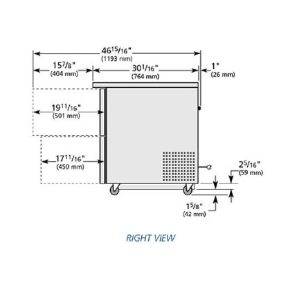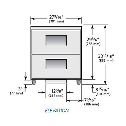 Undercounter Refrigerator, 34″ working height, 33 – 38°F, (2) drawers each, accommodates (1) 12″ x 20″ x 6″ food pan (NOT included), stainless steel top, front & sides, clear coated aluminum interior with stainless steel floor, 3″ castors, R290 Hydrocarbon refrigerant, 1/6 HP, 115v/60/1-ph, 2.0 amps, NEMA 5-15P, cULus, UL EPH Classified, CE, ADA Compliant, Made in USA