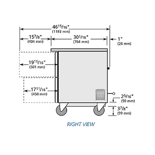 Undercounter Refrigerator, 33 – 38°F, (2) drawers each, accommodates (1) 12″ x 20″ x 6″ food pan (NOT included), stainless steel top, front & sides, clear coated aluminum interior with stainless steel floor, 5″ castors, R290 Hydrocarbon refrigerant, 1/6 HP, 115v/60/1-ph, 2.0 amps, NEMA 5-15P, cULus, UL EPH Classified, CE, Made in USA