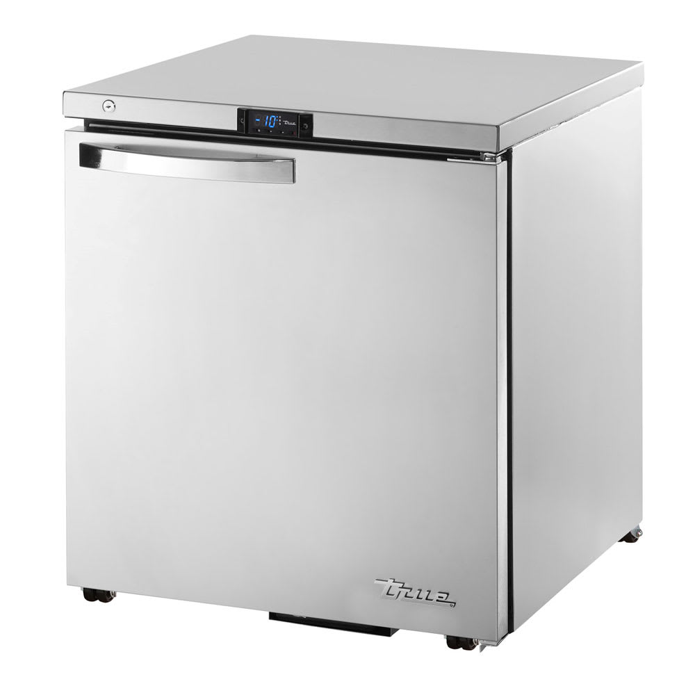 The overall dimensions of the True TUC-27F-LP-HC~SPEC1 Spec Series® undercounter freezer are 275⁄8 inches wide by 3215⁄16 inches deep by 317⁄8 inches tall. It is compact, able to fit in tight spaces under counters, and this unit has two wire shelves that are PVC coated and adjustable in 1⁄2-inch increments. To resist denting and rusting, the exterior is constructed of stainless steel.
