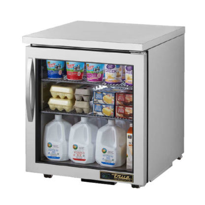 The True TUC-27G-LP-HC~FGD01 undercounter refrigerator has a low-profile 317/8-inch height. With a GalFan-coated steel back, the top, front, and ends are made of stainless steel. Included, are two heavy-duty, adjustable PVC-coated wire shelves, along with four chrome-plated shelf clips for each. These shelves are adjustable in 1/2-inch increments, and the shelf support pilasters are made of the same material as the cabinet interior. With safety-shielded, LED lights, this glass door has lighting throughout, while high-density, polyurethane insulation is foamed in place throughout the cabinet walls.