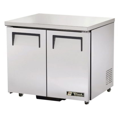 Because of its ADA-compliant, 34-inch working height, the True TUC-36-ADA-HC undercounter refrigerator is compact enough for use in bar areas and commercial kitchens, and it has 3-inch-diameter castors that enable it to be moved for maintenance and cleaning. Its stainless steel exterior is durable for heavy use, while both stainless steel doors have 12-inch recessed handles that are comfortable to use. When opened past 90 degrees, the doors stay open for efficient restocking, and to maximize storage space, the four PVC-coated wire shelves are adjustable.