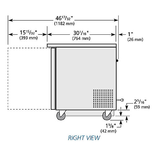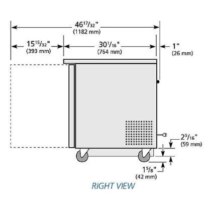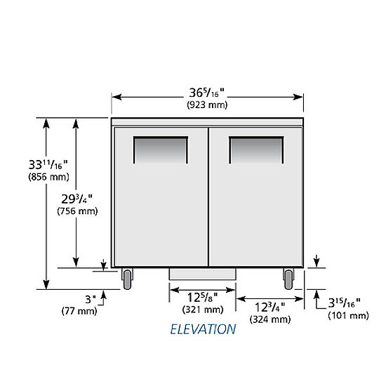 Undercounter Refrigerator, 34″ working height, 33 – 38°F, (2) stainless steel doors, (4) PVC coated adjustable wire shelves, stainless steel top, front & sides, aluminum interior with stainless steel floor, 3″ castors, R290 Hydrocarbon refrigerant, 1/6 HP, 115v/60/1-ph, 2.0 amps, NEMA 5-15P, cULus, UL EPH Classified, ADA Compliant, Made in USA