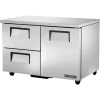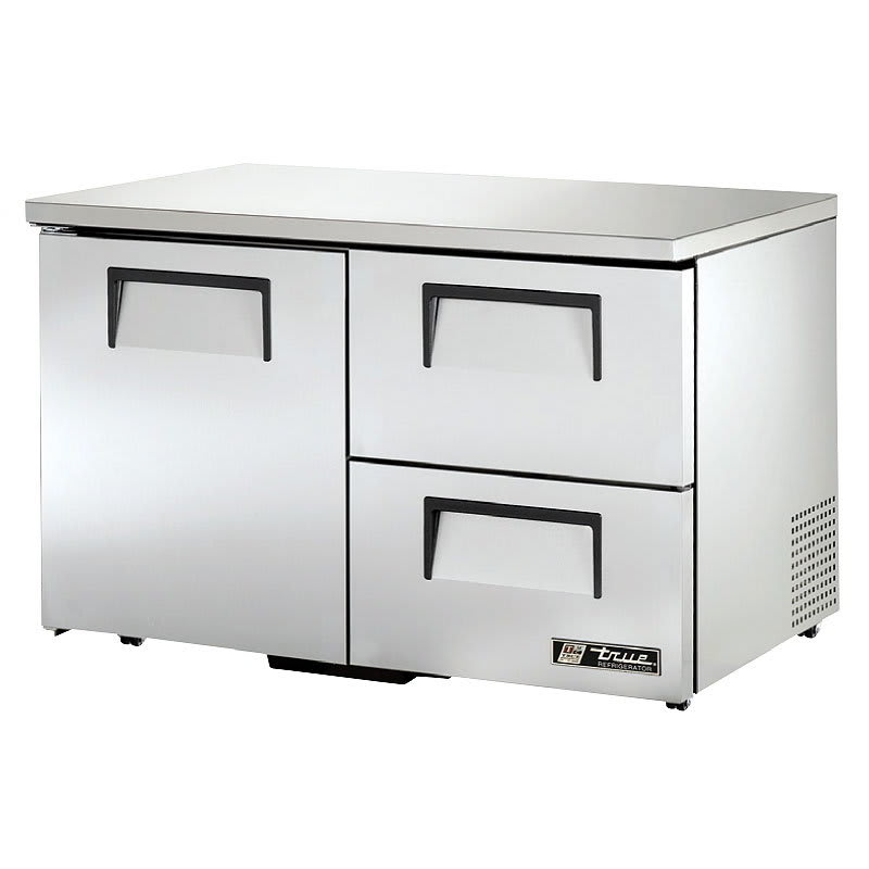 Because of its electronically commutated evaporator and condenser fan motors, this True TUC-48D-2-LP-HC undercounter refrigerator operates at high efficiencies and moves a consistent volume of air, which produces little heat and saves energy. Behind this unit’s door section, two adjustable shelves with a heavy-duty PVC coating hold stored items. The shelves measure 219/16 inches wide by 16 inches deep, and because they are wire, the shelves have gaps that encourage airflow and completely cool stored items. Both storage drawers are designed to hold a 12-inch-long by 18-inch-wide by 6-inch-deep food pan.