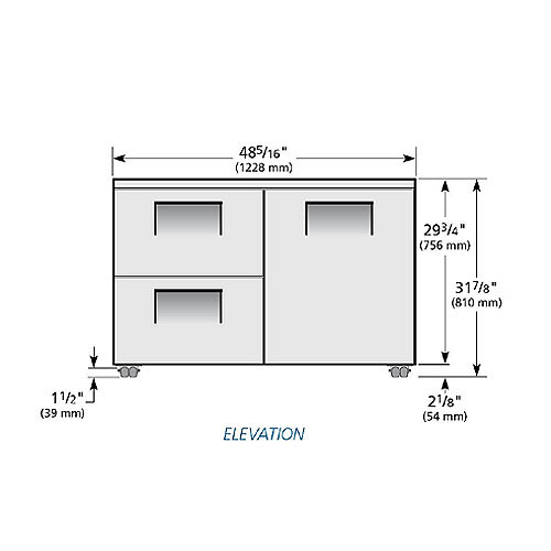 Low Profile Undercounter Refrigerator, 31-7/8″ counter height, 33 – 38°F, (1) stainless steel door, (2) shelves, (2) drawers each, accommodates (1) 12″ x 18″ x 6″ food pan (NOT included), stainless steel top & sides, clear coated aluminum interior with stainless steel floor, 1-1/2″ dual swivel castors, R290 Hydrocarbon refrigerant, 1/5 HP, 115v/60/1-ph, 3.0 amps, NEMA 5-15P, cULus, UL EPH Classified, CE, Made in USA