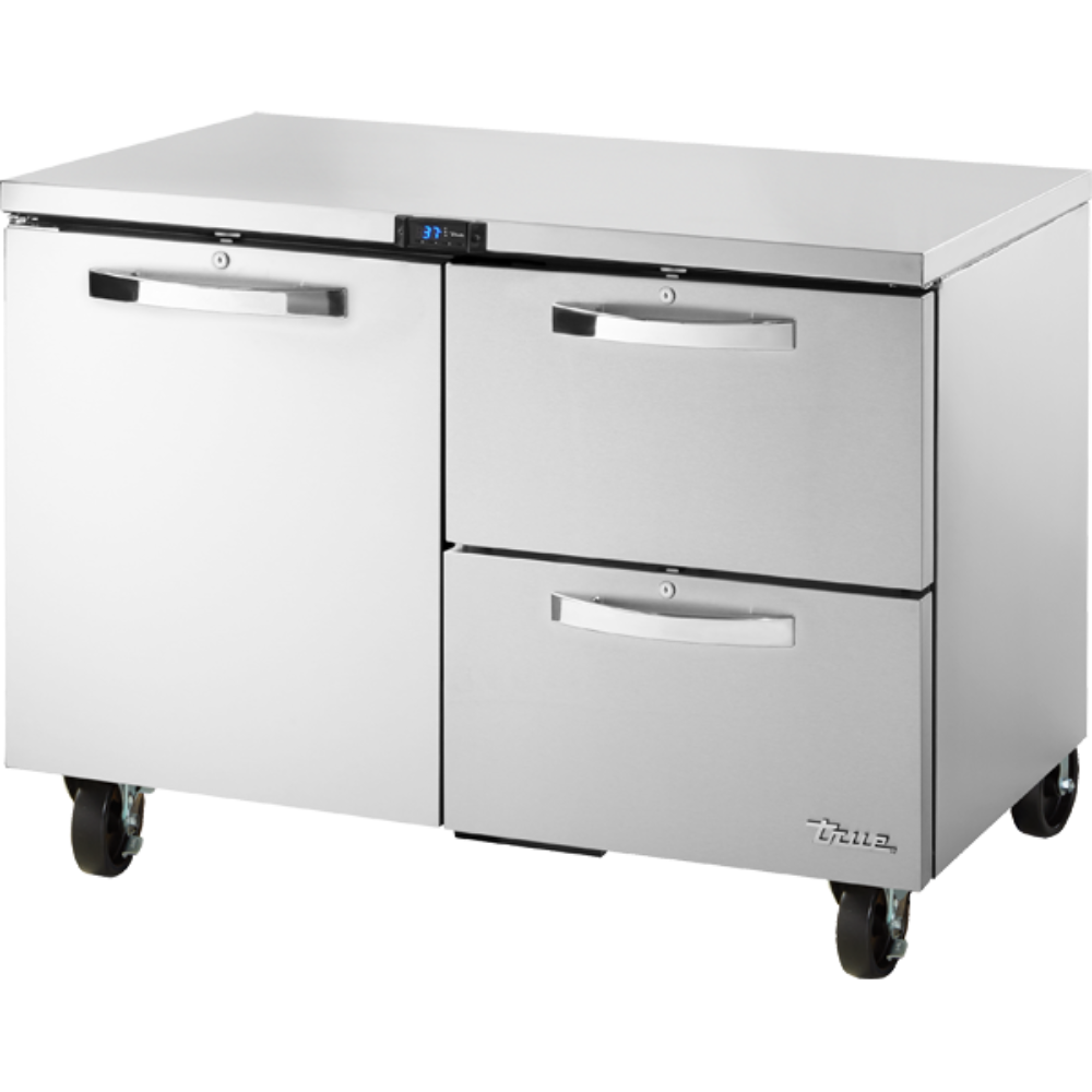 Providing cold storage space in tight prep areas, the True TUC-48D-2-LP-HC~SPEC3 undercounter refrigerator has a door section and two drawers. The door has two adjustable wire shelves that resist corrosion with a PVC coating. A 12-inch by 18-inch pan fits in each drawer, and smaller fractional pans can fit in the unit if the operator adds divider bars, which are sold separately. Durable and resistant to rusting, the interior and exterior of this undercounter are made of stainless steel.