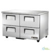 This True TUC-48D-4-HC undercounter refrigerator has four drawers, and each one can hold a full-size, 6-inch-deep food storage box. Although these drawers can hold more pans in different configurations, divider bars must be purchased separately to secure them in place. Drawer gaskets seal to the frame, minimizing cold-air leaks, and they can be removed without tools to simplify cleaning. Inside the cabinet, the floor is made of stainless steel with rounded corners that prevent debris from getting stuck.