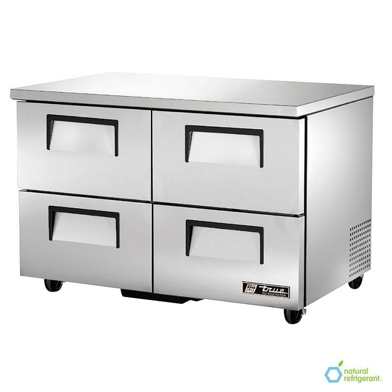 To provide uniform product temperatures, this True TUC-48D-4-HC undercounter refrigerator has an oversized refrigeration system that is factory balanced with a guided airflow. Its self-contained capillary tube system uses R290 hydrocarbon refrigerant-an eco-friendly alternative to traditional refrigerants. Fan motors in the system are electronically commutated, so they can evenly move cold air without creating a lot of heat or overusing energy. Adjustable by the operator to suit any application, the temperature ranges from 33 to 38 degrees Fahrenheit, and to retain cold air, the cabinet is foamed in place with polyurethane insulation in its walls. The unit’s exterior is constructed of stainless steel on the front, top, and ends with a corrosion-resistant, GalFan coating on the steel back.