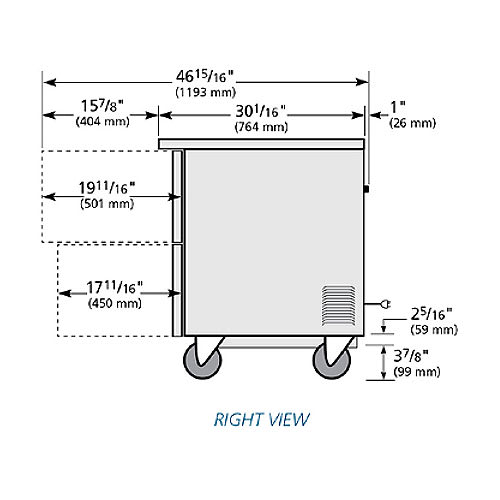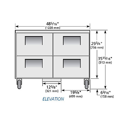Undercounter Refrigerator, 33 – 38°F, (4) drawers each, accommodates (1) 12″ x 18 x 6″ food pan (NOT included), stainless steel top & sides, aluminum interior with stainless steel floor, 5″ castors, R290 Hydrocarbon refrigerant, 1/5 HP, 115v/60/1-ph, 3.0 amps, NEMA 5-15P, cULus, UL EPH Classified, cULus, CE, Made in USA