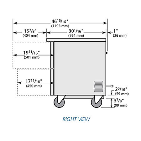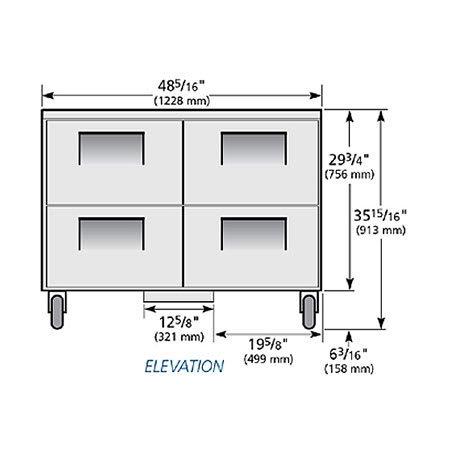 Undercounter Freezer, -10°F, (4) drawers each, accommodates 12″ x 18″ x 6″ pan (NOT included), stainless steel top & sides, aluminum interior with stainless steel floor, 5″ castors, R290 Hydrocarbon refrigerant, 1/2 HP, 115v/60/1-ph, 5.4 amps, NEMA 5-15P, cULus, UL EPH Classified, Made in USA