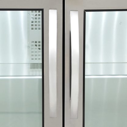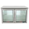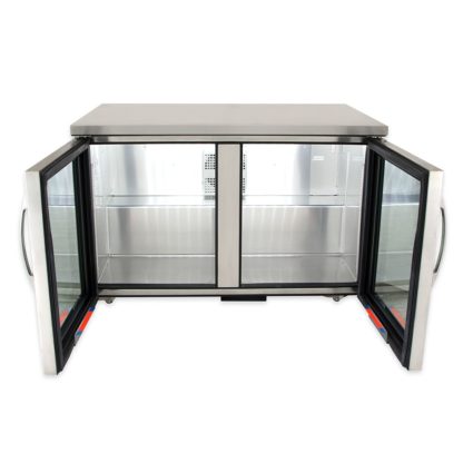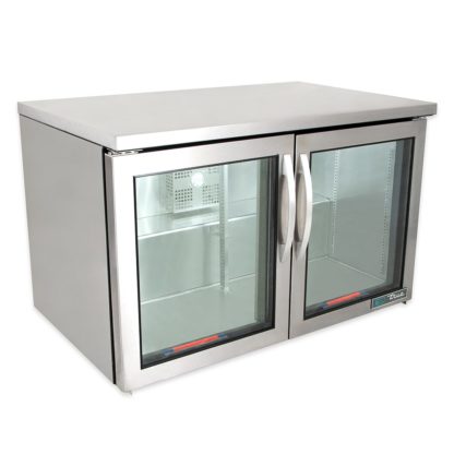 Low Profile Undercounter Refrigerator, 31-7/8″ counter height, 33 – 38°F, framed glass door version 01, stainless steel top & sides, (2) Low-E glass doors, (4) PVC coated adjustable wire shelves, LED interior lighting, aluminum interior with stainless steel floor, 1-1/2″ dual swivel castors, R290 Hydrocarbon refrigerant, 1/5 HP, 115v/60/1-ph, 3.0 amps, NEMA 5-15P, cULus, UL EPH Classified, CE, Made in USA