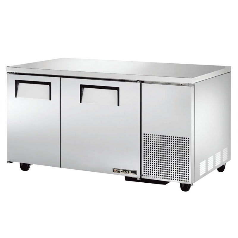 Inside, the True TUC-60-32-HC undercounter refrigerator is a clear-coated aluminum liner, and the cabinet has a coved stainless steel floor that facilitates cleaning. It stands on four 5-inch-diameter castors with locks on the front set, and so it can be rolled under counters, this unit has a 36-inch work surface height. For stability, high-density, polyurethane foams the solid doors and cabinet structure in place.
