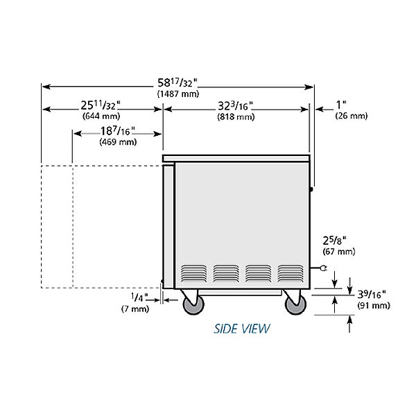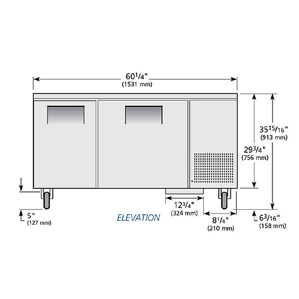 Deep Undercounter Refrigerator, 33 – 38°F, side mounted self-contained refrigeration, (2) stainless steel doors, (4) PVC coated adjustable wire shelves, stainless steel top & sides, aluminum interior with stainless steel floor, 5″ castors, R290 Hydrocarbon refrigerant, 1/10 HP, 115v/60/1-ph, 1.7 amps, NEMA 5-15P, cULus, UL EPH Classified, Made in USA