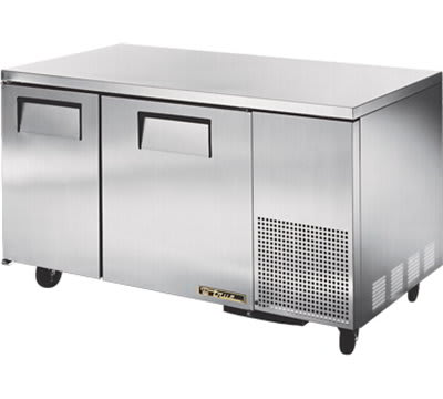 Temperatures in the True TUC-60-32-HC~SPEC1 Spec Series undercounter refrigerator are adjustable from 33 to 38 degrees Fahrenheit with the electronic controller. For monitoring, a digital display on the refrigerator shows the current temperatures, and the front of the 16-gauge countertop is flush with the front of the 20-gauge doors. For heavy use, the exterior front, top, sides, and back are constructed of stainless steel. High-density polyurethane foams the structure of the cabinet and solid doors in place.