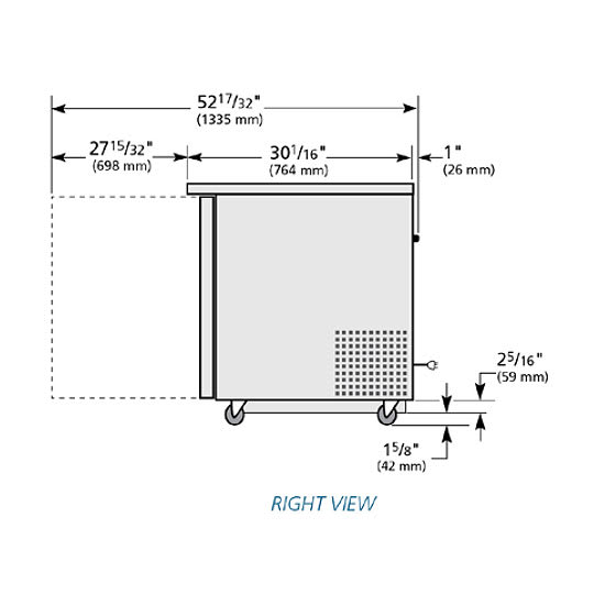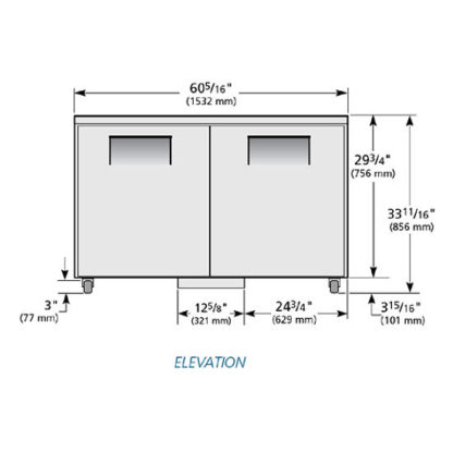 Undercounter Refrigerator, 34″ working height, 33 – 38°F, (2) stainless steel doors, (4) PVC coated adjustable wire shelves, stainless steel top & sides, aluminum interior with stainless steel floor, 3″ castors, R290 Hydrocarbon refrigerant, 1/4 HP, 115v/60/1-ph, 4.0 amps, NEMA 5-15P, cULus, UL EPH Classified, ADA Compliant, Made in USA