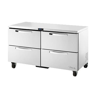 The True TUC-60D-4-HC~SPEC1 Spec Series undercounter refrigerator has four drawers that each accommodate one full-size food pan or varying size pan configurations using pan divider bars, which are sold separately. Its exterior is constructed of durable stainless steel, while the inside is lined with a stainless steel floor and coved corners for streamlined cleaning. Because the drawers are flush with the front of the countertop, this unit looks professional and takes up little aisle space. To retain cold air, the drawers have magnetic gaskets, and the drawer slides and rollers can be removed without tools.