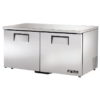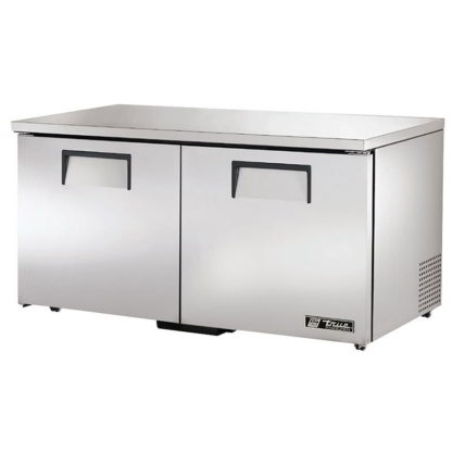 The exterior of the True TUC-60F-LP-HC two-section undercounter freezer is made of stainless steel with a GalFan-coated steel back and a clear-coated aluminum interior liner. Its entire cabinet structure and doors are foamed in place with a high-density polyurethane to seal cold air inside. For mobility, this unit is fitted with 11⁄2-inch-diameter castors and has a work surface height of 317⁄8 inches. To retain cold temperatures, the unit’s doors are self-closing, and to facilitate stocking, they have a 90-degree, stay-open feature. Four PVC-coated wire shelves support contents and are adjustable in 1⁄2-inch increments. Each shelf comes with four chrome-plated clips, and this pre-wired unit has an epoxy-coated evaporator to prevent corrosion.