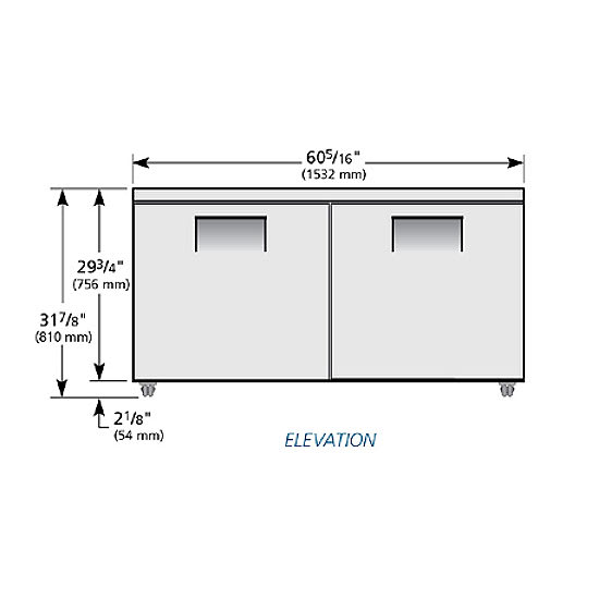 Low Profile Undercounter Freezer, 31-7/8″ counter height, -10°F, (2) stainless steel doors, (4) PVC coated adjustable wire shelves, stainless steel top & sides, aluminum interior with stainless steel floor, 1-1/2″ dual swivel castors, R290 Hydrocarbon refrigerant, reverse condensing fan motor, 1/2 HP, 115v/60/1-ph, 4.8 amps, NEMA 5-15P, cULus, UL EPH Classified, Made in USA