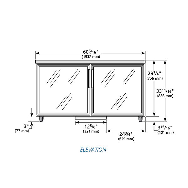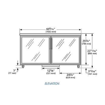 Undercounter Refrigerator, 34″ working height, 33 – 38°F, framed glass door version 01, (2) Low-E glass doors, (4) PVC coated adjustable wire shelves, aluminum interior with stainless steel floor, stainless steel top & sides, 3″ castors, R290 Hydrocarbon refrigerant, 1/4 HP, 115v/60/1-ph, 4.0 amps, NEMA 5-15P, cULus, UL EPH Classified, ADA Compliant, Made in USA