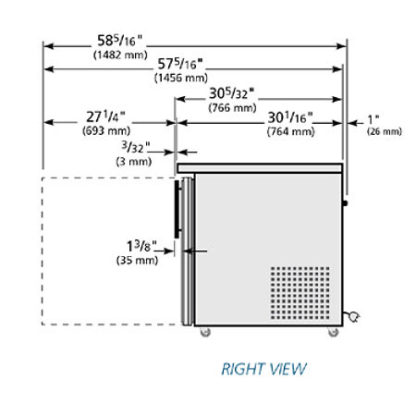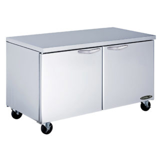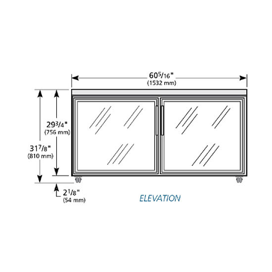 Low Profile Undercounter Refrigerator, framed glass door version 01, 31-7/8″ counter height, 33 – 38°F, (2) Low-E glass doors, (4) PVC coated adjustable wire shelves, stainless steel top & sides, aluminum interior with stainless steel floor, 1-1/2″ dual swivel castors, R290 Hydrocarbon refrigerant, 1/4 HP, 115v/60/1-ph, 4.0 amps, NEMA 5-15P, cULus, UL EPH Classified, Made in USA