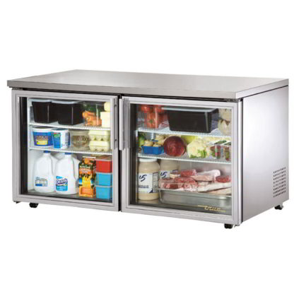 This True TUC-60G-LP-HC~FGD01 refrigerator features a stainless steel exterior with a GalFan-coated steel back and a clear-coated, aluminum-lined interior. Cold temperatures are maintained because of the high-density polyurethane insulation and low-e, double-pane glass doors. Fitted with 12-inch-long aluminum handles, both doors are self-closing and can stay open 90 degrees for efficient loading and unloading. Adjustable in 1/2-inch increments, four PVC-coated wire shelves can hold product, and each shelf has four chrome-plated shelf clips to secure them in place. Its safety-shielded, LED-lighted cabinet comes with 11/2-inch-diameter dual swivel castors and has a 317/8-inch work surface height.