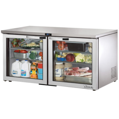 The four shelves in the True TUC-60G-LP-HC~SPEC1 Spec Series undercounter refrigerator are constructed of PVC-coated wire and are adjustable in 1/2-inch increments. Swinging within cabinet dimensions, both doors are lockable and self-closing with a 90-degree, stay-open feature. These doors are fitted with a 12-inch-long aluminum handle, while the cabinet is foamed in place using high-density polyurethane insulation. Constructed of stainless steel, the cabinet is mounted on 11/2-inch-diameter dual swivel castors for convenient placement.