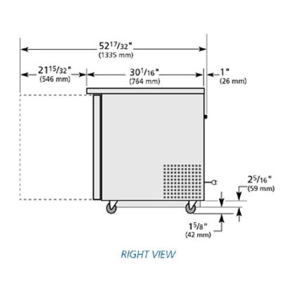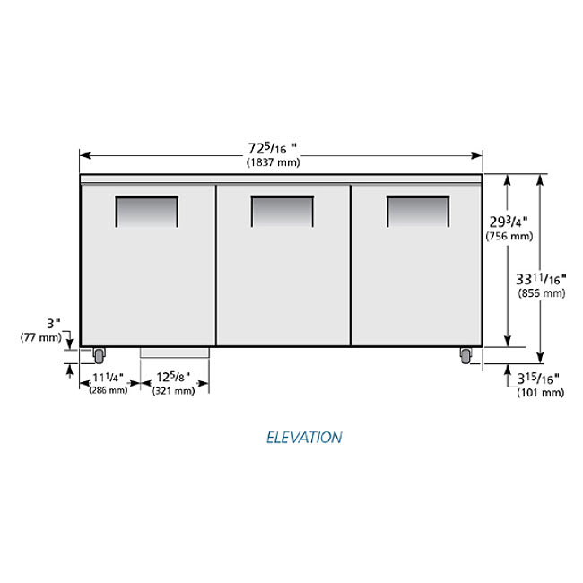 Undercounter Refrigerator, 34″ working height, 33 – 38°F, (3) stainless steel doors, (6) PVC coated adjustable wire shelves, stainless steel top & sides, aluminum interior with stainless steel floor, 3″ castors, R290 Hydrocarbon refrigerant, 1/4 HP, 115v/60/1-ph, 4.0 amps, NEMA 5-15P, cULus, UL EPH Classified, ADA Compliant, Made in USA