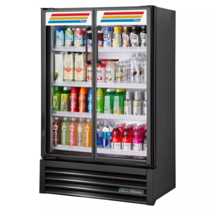 The True TVM-36SL-HC~VM01 glass door merchandiser has four PVC-coated, wire shelves adjustable on 1⁄2-inch centers with four chrome-plated shelf clips per shelf. The factory-engineered, capillary tube system uses R290 hydrocarbon refrigerant and maintains a temperature—set by the operator—between 33 and 38 degrees Fahrenheit. Electronically commutated evaporator and condenser fan motors are state-of-the-art and operate efficiently to move air consistently with little heat and energy. The evaporator is epoxy coated to prevent corrosion and the condensing unit is bottom mounted, expediting maintenance and raising merchandise to a high, accessible level.