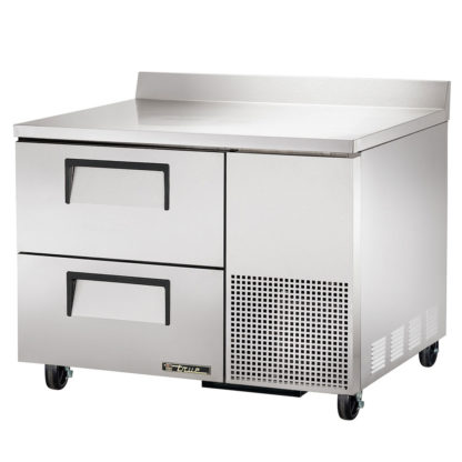 The True TWT-44D-2-HC worktop refrigerator is made of stainless steel with a GalFan-coated, steel back for corrosion resistance. Its interior is made of a clear-coated, aluminum liner with a coved stainless steel floor and the entire structure is insulated with environmentally friendly, polyurethane foam. The backsplash keeps food particles and from sliding underneath the refrigerator. For stability, the 5-inch stem castors have locks provided on the front set and the work surface is 36 inches high for user comfort.