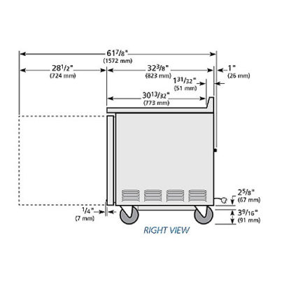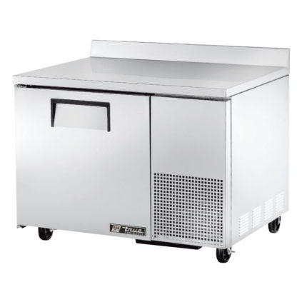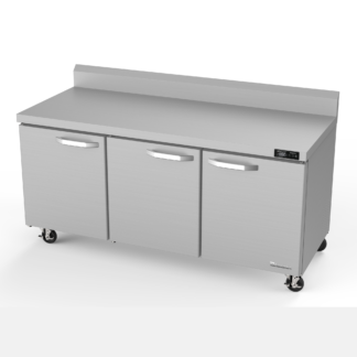 Deep Work Top Freezer, one-section, stainless steel top with rear splash, (1) stainless steel door, (2) PVC coated adjustable wire shelves, stainless steel front & sides, aluminum interior with stainless steel floor, 5″ castors, side mount front breather, R290 Hydrocarbon refrigerant, 1/2 HP, 115v/60/1-ph, 5.8 amps, NEMA 5-15P, cULus, UL EPH Classified, Made in USA
