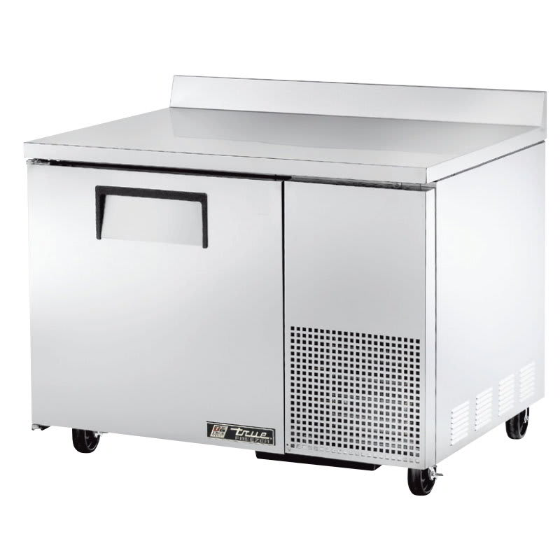 The True TWT-44F-HC worktop freezer has a positive-seal door, which swings within cabinet dimensions. Its 12-inch-long, recessed handle is foamed in place with a sheet metal interlock to ensure permanent attachment. Magnetic door gaskets are made from one piece, so they can be remove and cleaned efficiently. This stainless steel unit features a GalFan-coated, steel back designed to protect the unit from corrosion, and the interior is lined with clear-coated aluminum for durability. The interior is foamed in place with high-density polyurethane insulation and features coved corners. The backsplash prevents debris from slipping off the top and underneath the unit. This freezer has a work surface height of 36 inches and lockable, 5-inch stem castors.