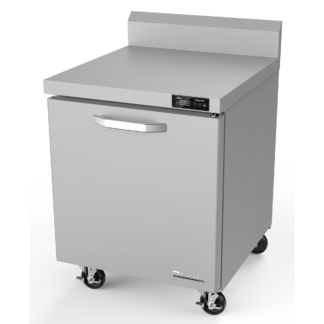 SPEC SERIES Work Top Refrigerator, two-section, rear mounted self-contained refrigeration, SPEC Package 3 includes: 16-ga. stainless steel top with rear splash, (2) heavy-duty stainless steel doors, steel handles, door lock standard, (4) PVC coated adjustable wire shelves, electronic temperature control with digital temperature display, stainless steel front, sides & back, stainless steel interior, 5″ castors, R290 Hydrocarbon refrigerant, 1/5 HP, 115v/60/1-ph, 3.0 amps, NEMA 5-15P, cULus, UL EPH Classified, CE, Made in USA