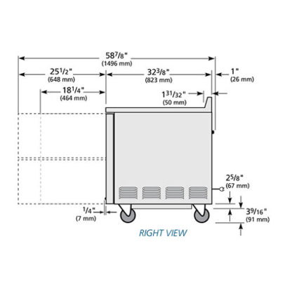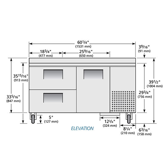 Deep Work Top Refrigerator, two-section, stainless steel top with rear splash, (1) stainless steel door, (2) PVC coated adjustable wire shelves, (2) drawers each, accommodates (2) 12″ x 20″ x 8″ pans (not included), stainless steel front & sides, aluminum interior with stainless steel floor, 5″ castors, R290 Hydrocarbon refrigerant, 1/10 HP, 115v/60/1-ph, 1.7 amps, NEMA 5-15P, side mount front breather, cULus, UL EPH Classified, Made in USA