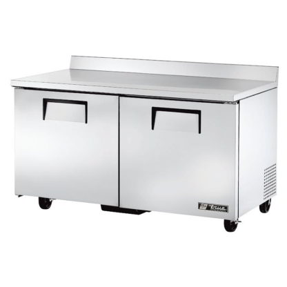 The True TWT-60F-HC worktop freezer has a stainless steel countertop for food preparation, and a backsplash integrated into the top prevents messes from reaching the wall. In the two-section refrigerated base, stored items are held on four PVC-coated wire shelves that have gaps to promote even airflow and are adjustable to accommodate a variety of products. The doors on this unit self-close to retain cold air and stay open past 90 degrees for loading and unloading.