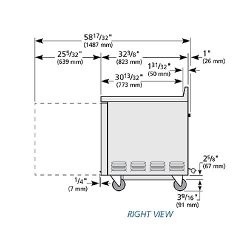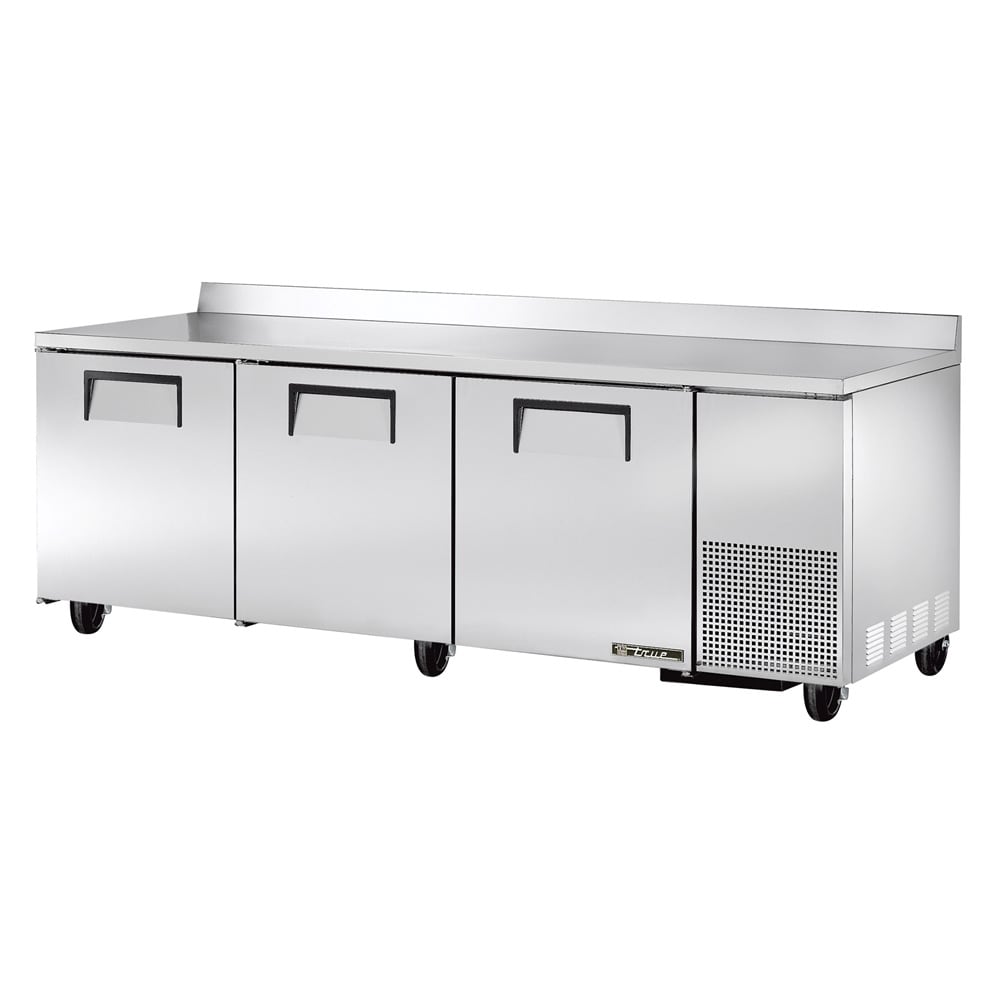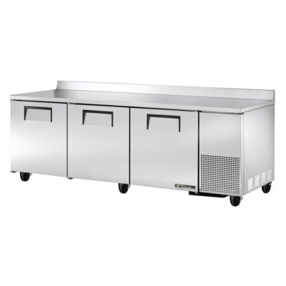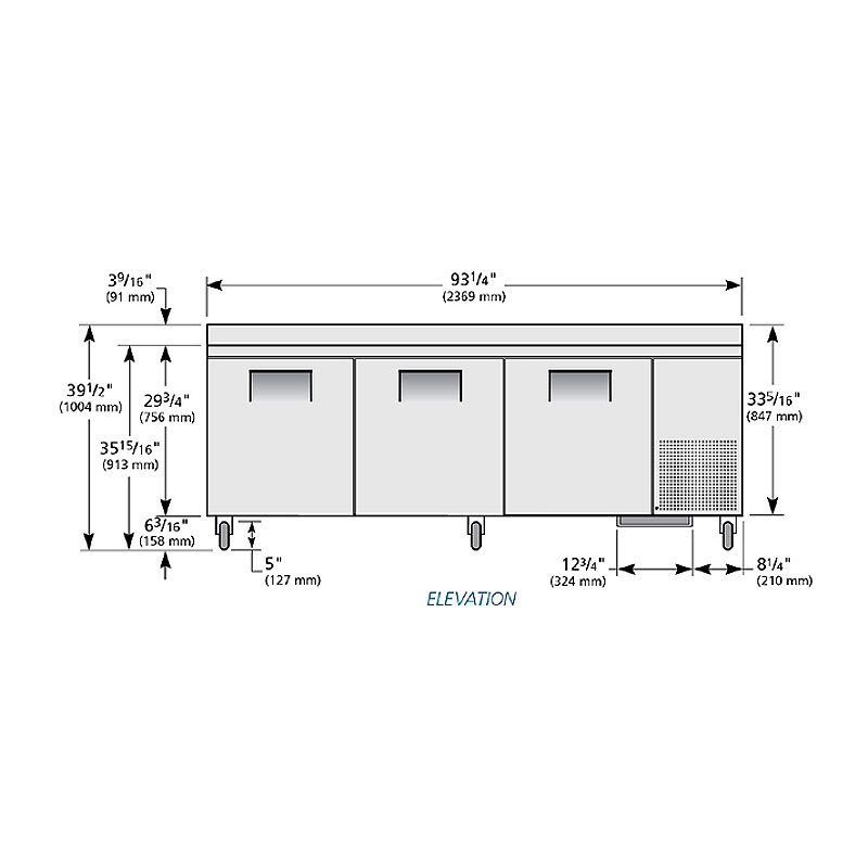 Deep Work Top Refrigerator, three-section, stainless steel top with rear splash, (3) stainless steel doors, (6) PVC coated adjustable wire shelves, stainless steel front & sides, aluminum interior with stainless steel floor, 5″ castors, side mount front breather, R290 Hydrocarbon refrigerant, 1/5 HP, 115v/60/1-ph, 2.2 amps, NEMA 5-15P, cULus, UL EPH Classified, Made in USA