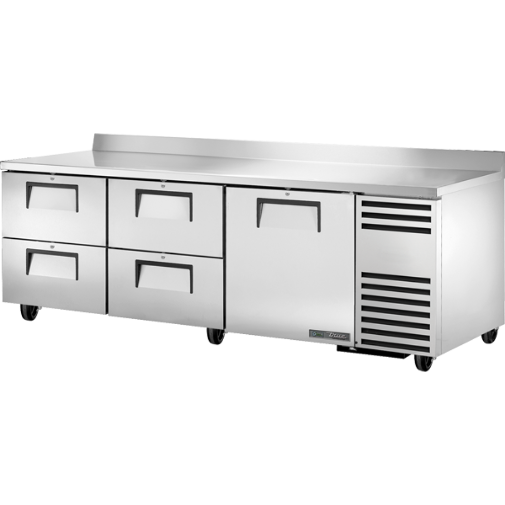 Deep Work Top Refrigerator, three-section, stainless steel top with rear splash, (1) stainless steel door, (2) PVC coated adjustable wire shelves, (4) drawers each, accommodates (2) 12″ x 20″ x 8″ pans (not included), stainless steel front & sides, aluminum interior with stainless steel floor, 5″ castors, side mount front breather, R290 Hydrocarbon refrigerant, 1/5 HP, 115v/60/1-ph, 2.2 amps, NEMA 5-15P, cULus, UL EPH Classified, Made in USA