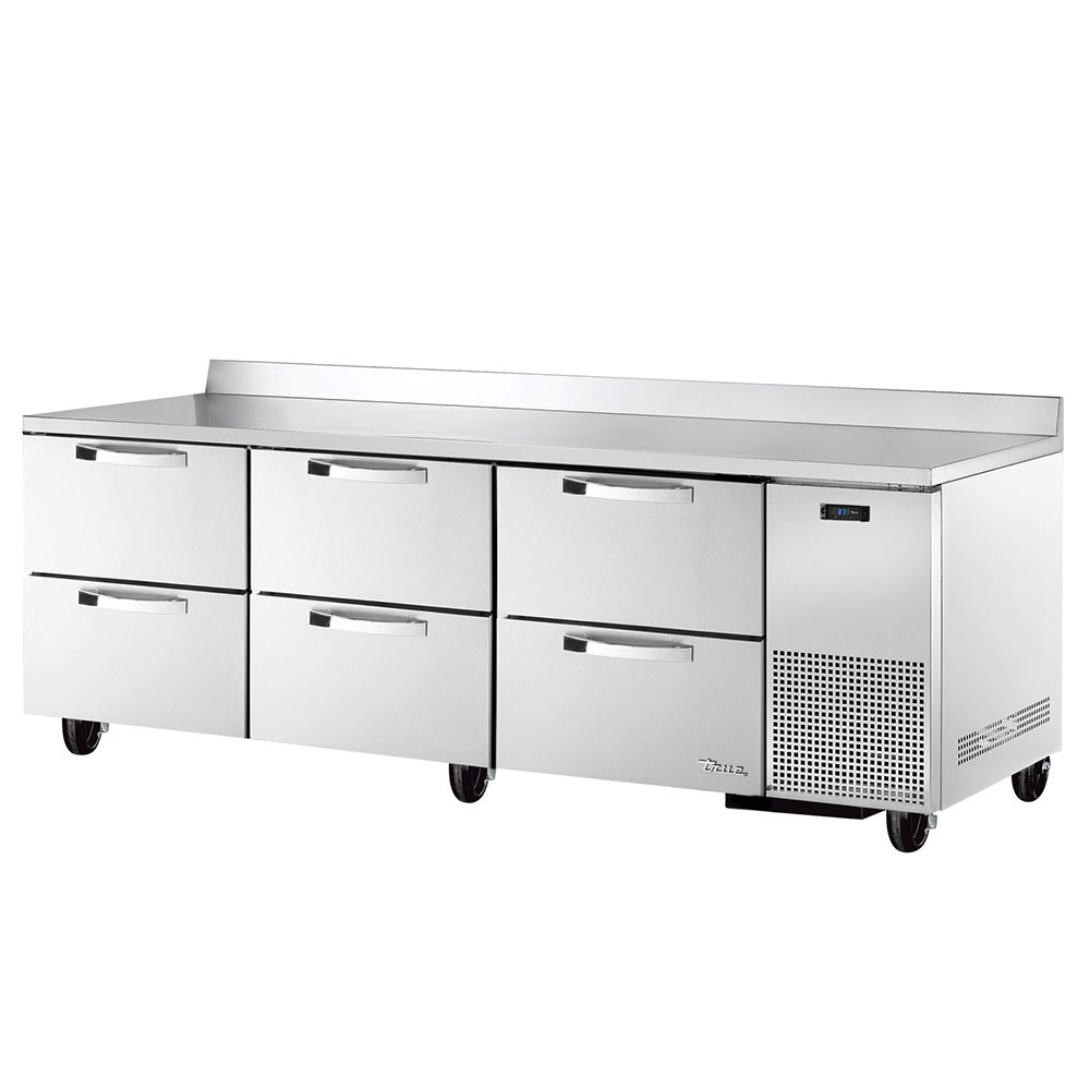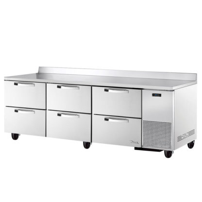 SPEC SERIES® Deep Work Top Refrigerator, three-section, SPEC Package 3 includes: 16-ga. stainless steel top with rear splash, (6) drawers each, accommodates (2) 12″ x 20″ x 8″ pans (not included), steel handles, electronic temperature control with digital temperature display, stainless steel front, sides & back, stainless steel interior, 5″ castors, side mount front breather, R290 Hydrocarbon refrigerant, 1/5 HP, 115v/60/1-ph, 2.2 amps, NEMA 5-15P, cULus, UL EPH Classified, Made in USA
