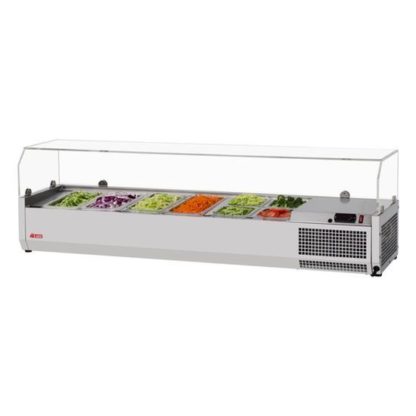 E-Line Countertop Salad Table, with clear hood, 59″L, side mounted self-contained refrigeration, accommodates (12) GN 1/6 size or (6) GN 1/3 size 6″ deep condiment pans (pans not included), digital temperature display on front panel, static cooling system, R290 Hydrocarbon refrigerant, stainless steel interior & exterior, 1/6 HP, 115v/60/1-ph, 2 amps, NEMA 5-15P, cETLus, ETL-Sanitation (contact sales for lead time)