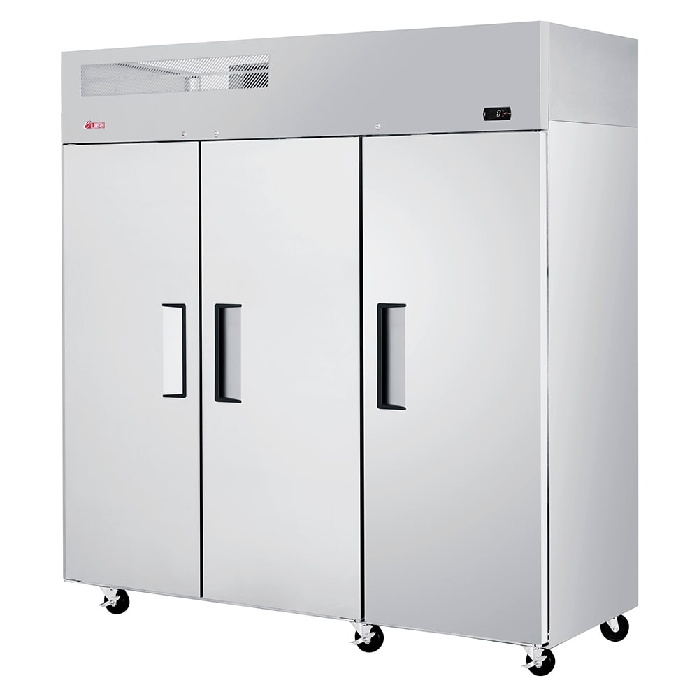 This 3-section Turbo Air EF-72-3-N reach-in freezer gives restaurant kitchens plenty of cold storage space for goods such as meats or vegetables. Its interior is fitted with nine adjustable shelves that can be moved to new orientations to account for objects of differing sizes. To ensure proper, safe storage, the freezer can hold items from -10 to 0 degrees Fahrenheit.