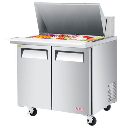 With its temperature holding range of 33 to 39 degrees Fahrenheit, the Turbo Air EST-36-15-N6 sandwich prep table properly refrigerates most cold storage items. Its 91/2-inch-deep cutting board gives foodservice staff a place to assemble meals. Below it, a storage cabinet can be used to hold additional ingredients or food pan refills.