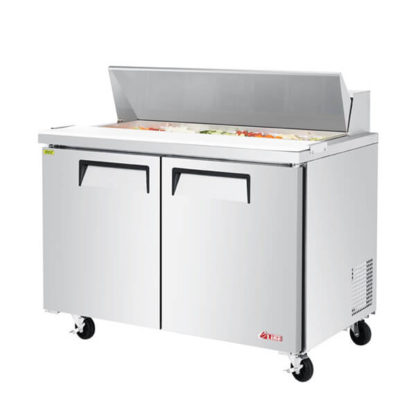 Outfit your restaurant with this Turbo Air EST-48-N E-line 48 1/4″ 2 door refrigerated sandwich prep table! With its aluminum exterior, galvanized steel back and bottom, stainless steel and aluminum interior, this prep table is designed to be an economical but durable and easy-to-clean option for cafes, diners, and restaurants. It has a standard top design that can hold up to (12) 1/6 size, 4″ deep pans that come included with the refrigerator so you can get set up to start serving freshly-made sandwiches right away.