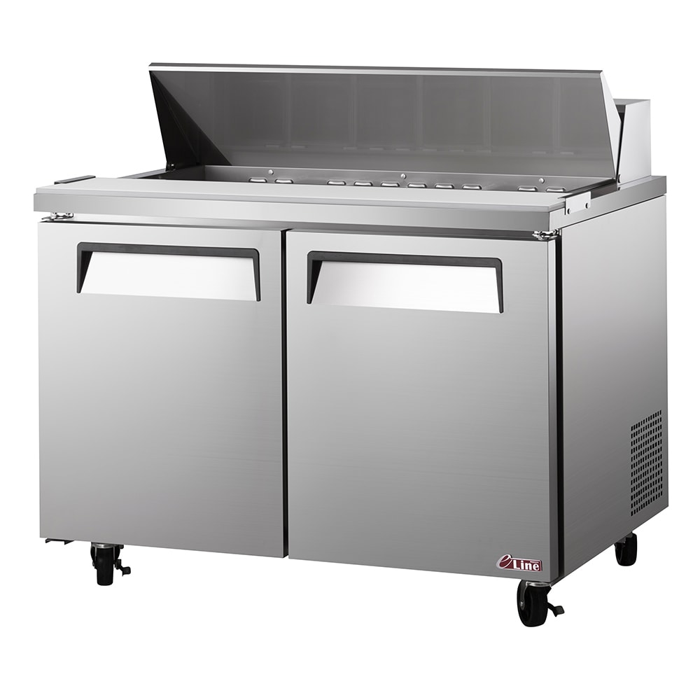 This Turbo Air EST-60-N sandwich prep table’s 16 cubic feet of storage space gives its refrigerated base plenty of space to hold extra ingredients and backup topping bins. It’s foamed with high-density polyurethane that insulates the base and strengthens it for extended service life. The table’s doors are solid to reduce thermal loss.