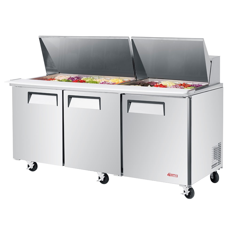 This Turbo Air EST-72-30-N sandwich prep table also has a refrigerated base that’s ideal for storing spare ingredients or refill food pans. The table holds temperatures of 33 to 39 degrees Fahrenheit-sufficient for safe cold storage. Foamed, polyurethane insulation strengthens the base cabinet and retains cold air.