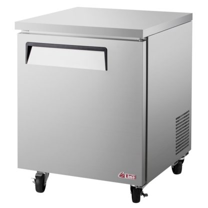 E-line Undercounter Freezer, one section, 27-1/2″W, 6.97 cu.ft., (1) solid door with easy grip handle, (1) adjustable PE coated wire shelf, insulated, stainless steel & aluminum interior, aluminum exterior (galvanized steel back & bottom), rear-mount self-contained refrigeration, R290 Hydrocarbon refrigerant, 3/8 HP, 115v/60/1-ph, 2.2 amps, NEMA 5-15P, cETLus, ETL-Sanitation