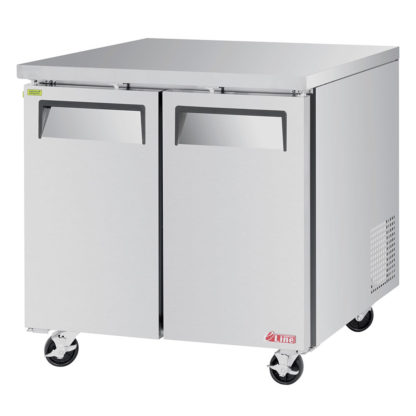 The Turbo Air EUF-36-N two-section undercounter freezer is insulated with high-density polyurethane to effectively contain cold air and reduce energy usage as it runs. Molded-in handles on the doors provide a secure gripe that won’t loosen over time or become snagged on clothing as users pass. For simplified cleaning procedures, the unit’s interior is made of stainless steel and aluminum, and the magnetic door gaskets can be removed for full access.