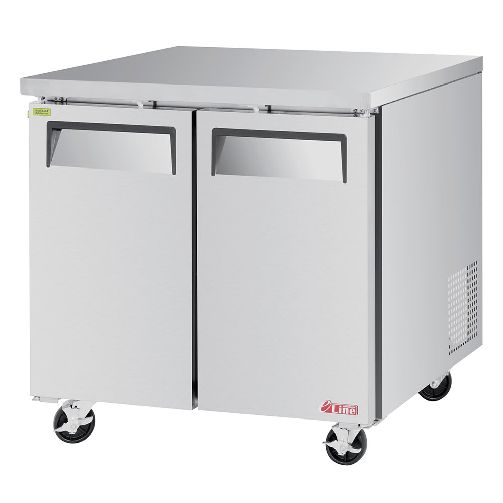 E-line Undercounter Freezer, two section, 36-3/8″W, 9.7 cu.ft., (2) solid doors with easy grip handles, (2) adjustable PE coated wire shelves, insulated, stainless steel & aluminum interior, aluminum exterior (galvanized steel back & bottom), rear-mount self-contained refrigeration, R290 Hydrocarbon refrigerant, 3/8 HP, 115v/60/1-ph, 2.6 amps, NEMA 5-15P, cETLus, ETL-Sanitation